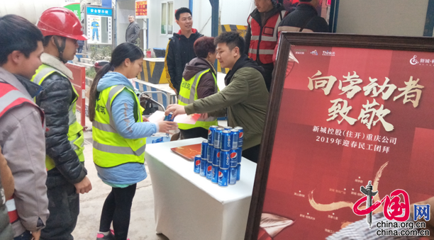 中国网1月29日讯(罗兵) 1月25日,新城控股重庆公司举行了“向劳动者致敬,新城控股(住开)重庆公司2019年迎春工友团拜”活动,联动包括朗隽大都会、琅樾江山、金樾府、悦隽风华、玺樾九里、和昱麟云、黛山道8號七大项目,向临近春节仍然坚守在一线岗位的近五百名建筑工人们,传递了新城重庆公司对合作伙伴的感谢与关怀,并送上新城重庆公司的新春祝福。