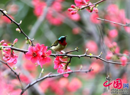 中国网2月19日讯 重庆市云阳县龙脊岭公园海棠花竞相绽放,朵朵鲜艳诱人。随着气候回暖,云阳县城龙脊岭长廊、三峡移民文物园等地的红梅、海棠、山桃花盛开,引来大量市民群众和游客踏春赏花和摄影爱好者捕捉“春天的讯息”,传递出浓郁的春的景象。(邓磊)