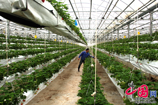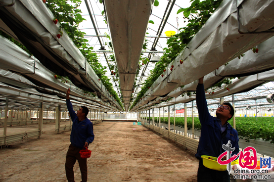 中国网2月27日讯 你见过在空中种的草莓吗?2月26日上午,记者在重庆铜梁区土桥镇新陆有机蔬果基地草莓大棚里见到了这一景象。只见宽敞明亮的大棚上里,一垄垄的草莓悬在上空,红艳艳的草莓果缀满枝头,人站在地上不弯腰就伸手可摘。