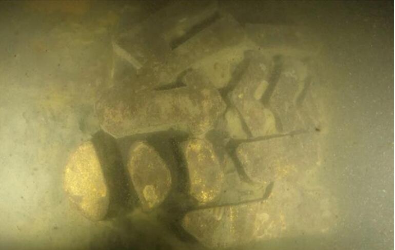 这是辽宁庄河海域甲午沉舰遗址(经远舰)水下考古调查中拍摄的悬挂于“经远舰”舰体舷侧的“经”“远”二字(拼版资料照片)。新华社发