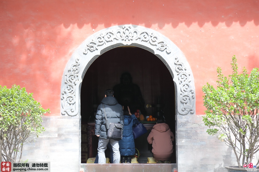 天王殿内跪拜的人们
