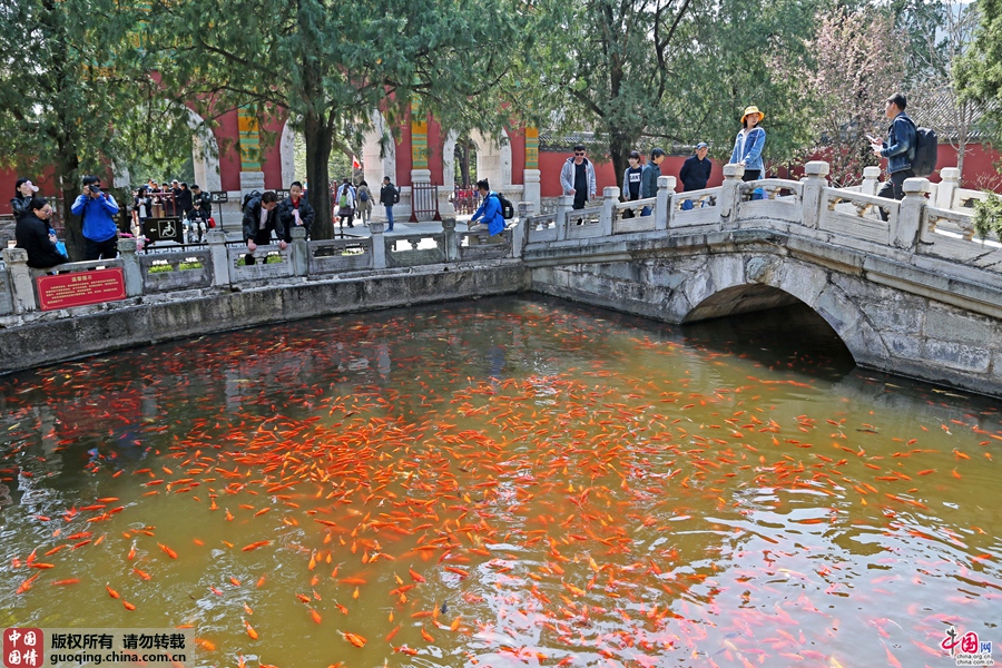 放生池内金鱼数量众多