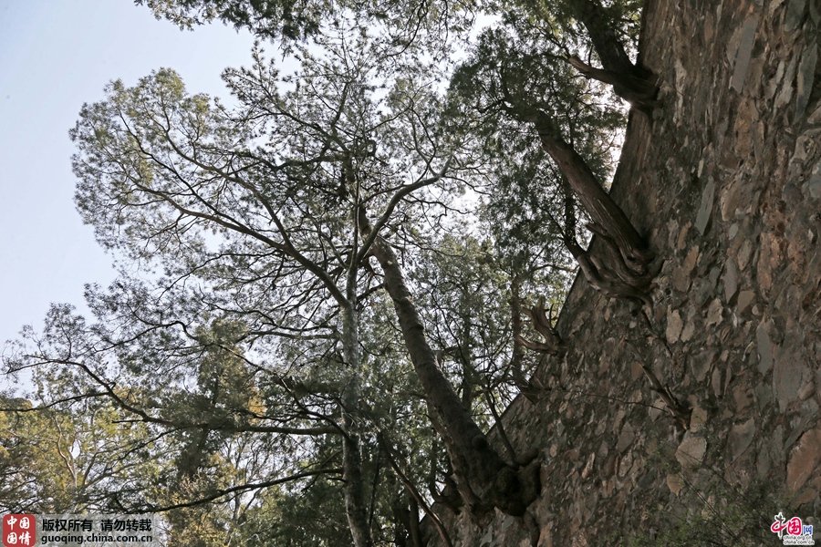 水泉院内柏树从绝壁石缝里生长