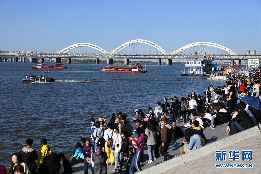 5月2日,在哈尔滨防洪纪念塔广场附近的松花江畔,许多游客坐在台阶上欣赏江景。 当日是五一假期的第二天,在冰城哈尔滨市,许多市民和游客来到户外游玩休闲,欣赏春色。 新华社记者王建威摄