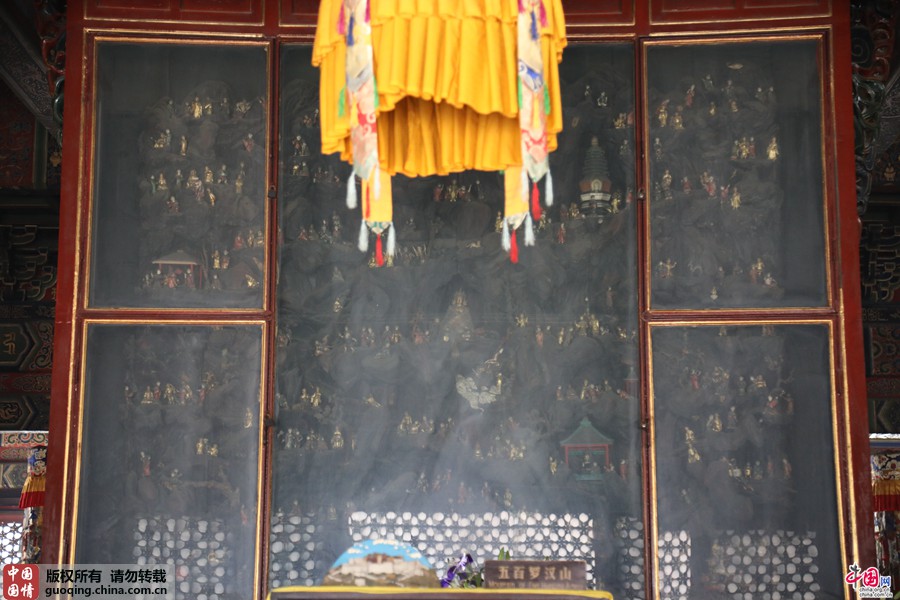 宗喀巴大师的铜坐像背后有紫檀木雕成的五百罗汉山