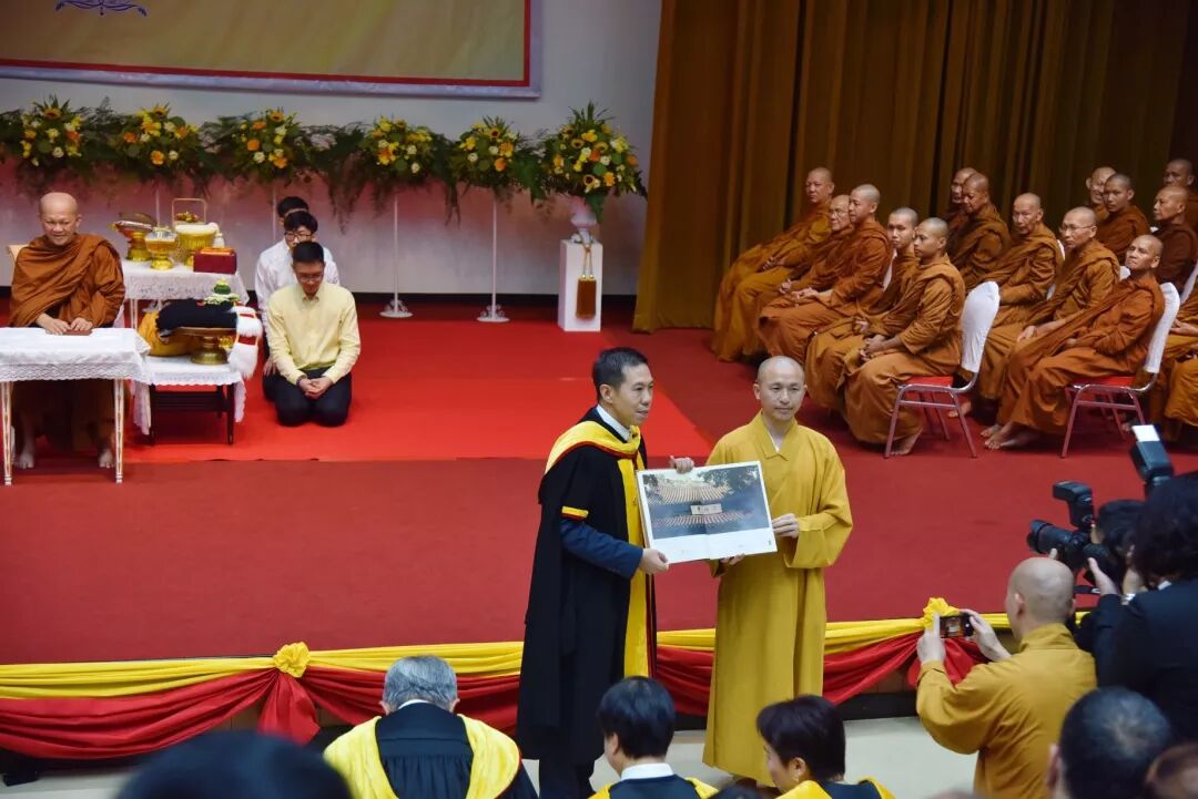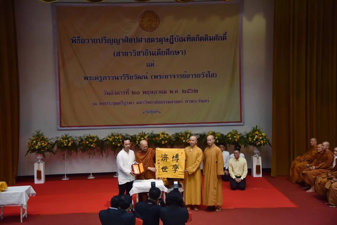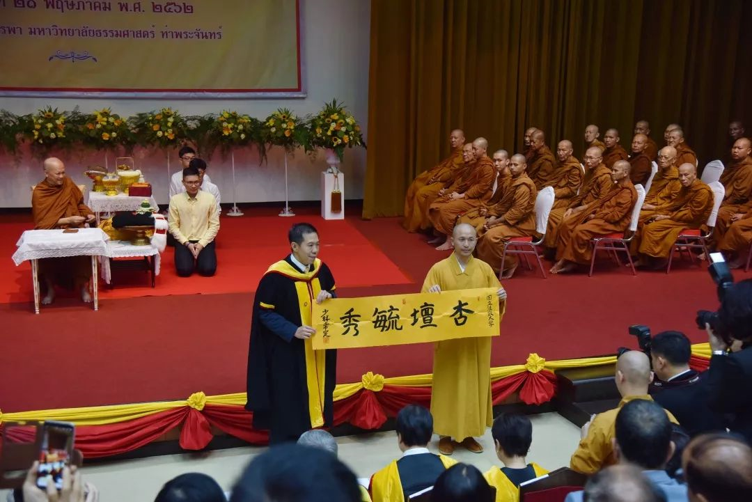 现场,少林寺常定方丈向长老赠送书法“博学济世”,向泰国国立法政大学赠送书法“杏壇毓秀”及《禅武少林》画册。