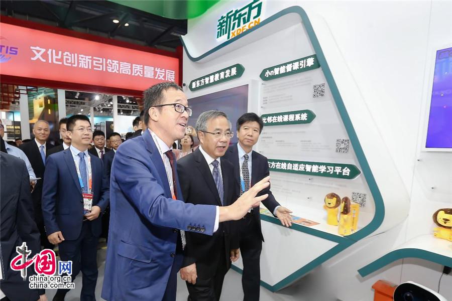 新东方教育科技集团董事长俞敏洪向中共中央政治局委员、国务院副总理胡春华介绍新东方智慧教育项目