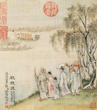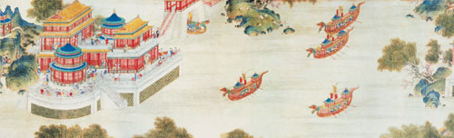 有关竞渡的仪式、规定、技巧和情景也因时因地不同而丰富多彩。“五月五日天晴明,杨花绕江啼晓莺。使君未出郡斋外,江上早闻齐和声。使君出时皆有准,马前已被红旗引。两岸罗衣破晕香,银钗照日如霜刃。鼓声三下红旗开,两龙跃出浮水来。棹影斡波飞万剑,鼓声劈浪鸣千雷。鼓声渐急标将近,两龙望标目如瞬。坡上人呼霹雳惊,竿头彩挂虹霓晕。前船抢水已得标,后船失势空挥桡。”“锣挟鸣涛鼓骇雷,红旗斜插剪波来。锦标夺到轩腾处,风卷龙髯雪作堆。”唐人张建封的《竞渡歌》,将千年前龙舟竞渡的热闹场面跃然纸上。诗中提到的“标”即“标杆”,或“标船”,是各龙船争夺的目标。“标杆”上悬挂锦彩、银碗、钱钞等赏物,立于水中,先到者先得。“标船”设置在终点,当竞渡的龙舟接近时,将“标”抛入水中,让诸“龙”争夺。标又分“鱼标”、“鸭标”和“铁标”等。鱼标、鸭标是活的,投入水中即刻游走,要一下子捉住,并不容易。铁标重,抛落江中便沉水底,没有熟练的潜水本领,更是得不到的。因此,龙船上一般都要安排一两个水性极好的“标手”,专司夺标之职。