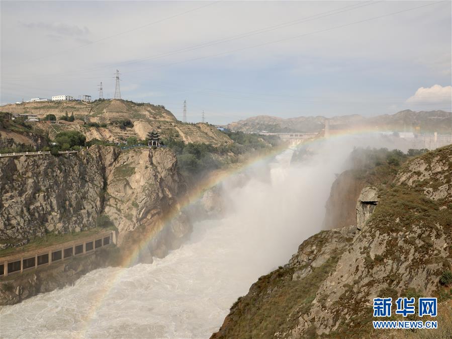 7月10日,刘家峡水库正在泄洪,水如白练,彩虹跨于其上。 位于甘肃省临夏回族自治州永靖县的刘家峡水库是黄河上游重要的水利调蓄工程。6月中旬起,水库提闸泄水,为黄河度汛提供保障。 新华社记者 张玉洁 摄