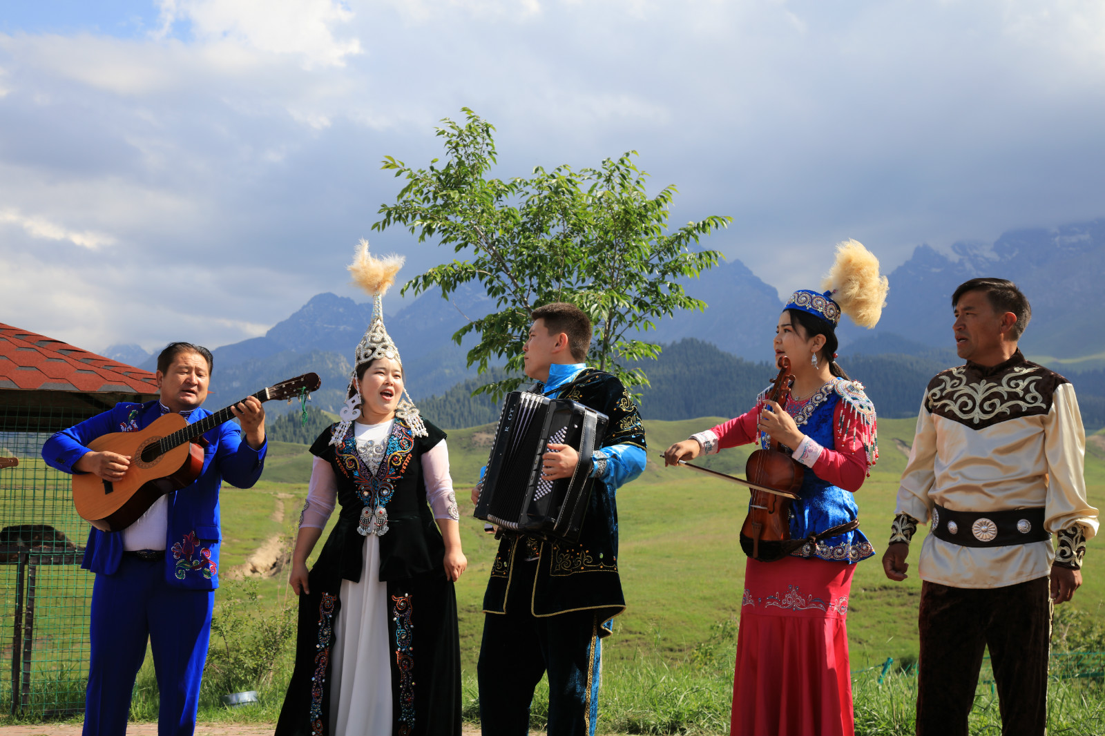 方如果介绍,鹿角湾也是当地哈萨克族传统的夏牧场,每年夏天,是一年中最热闹的时节。我们到访时,居住在鹿角湾景区内的哈萨克族男女老少正在聚会。他们穿着传统民族服饰,唱歌跳舞,欢迎来自远方的客人。