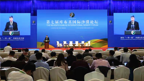中国网讯 2019年7月27日至28日,第七届库布其国际沙漠论坛在内蒙古库布其沙漠举行。本届论坛的主题为“绿色‘一带一路’,共建生态文明”。中央政治局委员、国务院副总理孙春兰,全国政协副主席万钢出席会议,来自30多个国家和地区的400多位政要、专家、企业界代表和媒体代表与会,围绕“一带一路”沿线荒漠化防治与合作、消除贫困、沙漠生态科技创新、绿色金融创新与发展、促进生物多样性保护、应对气候变化等全球高度关注的问题探讨交流。中央企业贫困地区产业投资基金(以下简称央企扶贫基金)应邀参会。