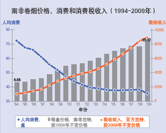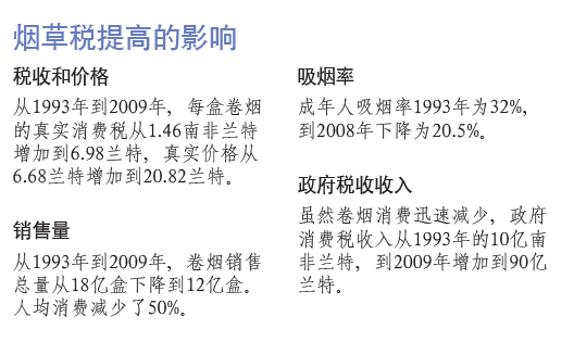 从1993年到2009年,南非卷烟总税负(包括消费税和销售税)从占零售价的32%提高到52%。同期,卷烟销售量减少了30%,政府烟草税收入增加了800%,成年人吸烟率下降了25%。