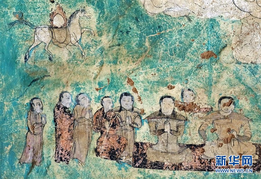 阿尔寨石窟内的一处壁画(2018年9月4日摄)。 内蒙古自治区鄂托克旗对“草原敦煌”阿尔寨石窟壁画和岩体进行全面保护,眼下石窟本体加固工程基本完成。 新华社记者 贾立君 摄