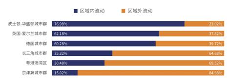 此外,我们还发现我国与国际城市群在人才流动上表现出不同的特点,在波士顿-华盛顿城市群、英国-爱尔兰城市群和德国城市群中,数字人才均偏向区域内流动,比例均超过60%;而京津冀、长三角和粤港澳三大城市群表现出相反的趋势,数字人才对区域外的流动比例超过区域内,区域外流动占比均超过60%,特别是京津冀城市群的区域外流动占比在85%左右。相比于国外较为稳定的基于地域优势的数字经济产业体系,我国的数字产业集群还处于动态发展和演进的过程中。