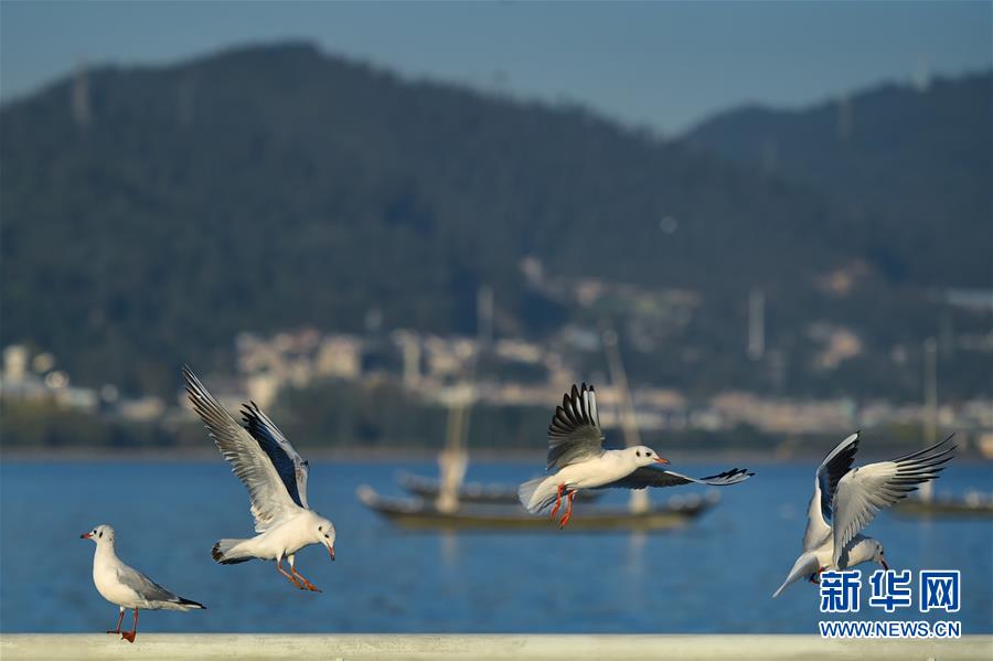 11月17日,红嘴鸥在滇池栖息。 每年冬季,数万只红嘴鸥飞临昆明越冬。据介绍,近年来飞临昆明越冬的红嘴鸥数量逐年增加,成为“春城”昆明的一道独特景观。 新华社记者 李芒茫 摄