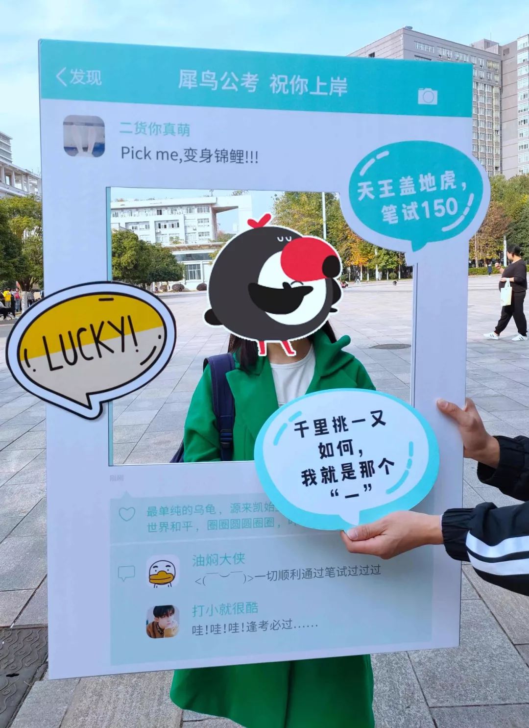 这些励志标语十分贴合当下公考人群的喜好,不少考生主动拍照留念。据悉,这些独特的“陪考团”一直从考生进场陪伴到下午考完。