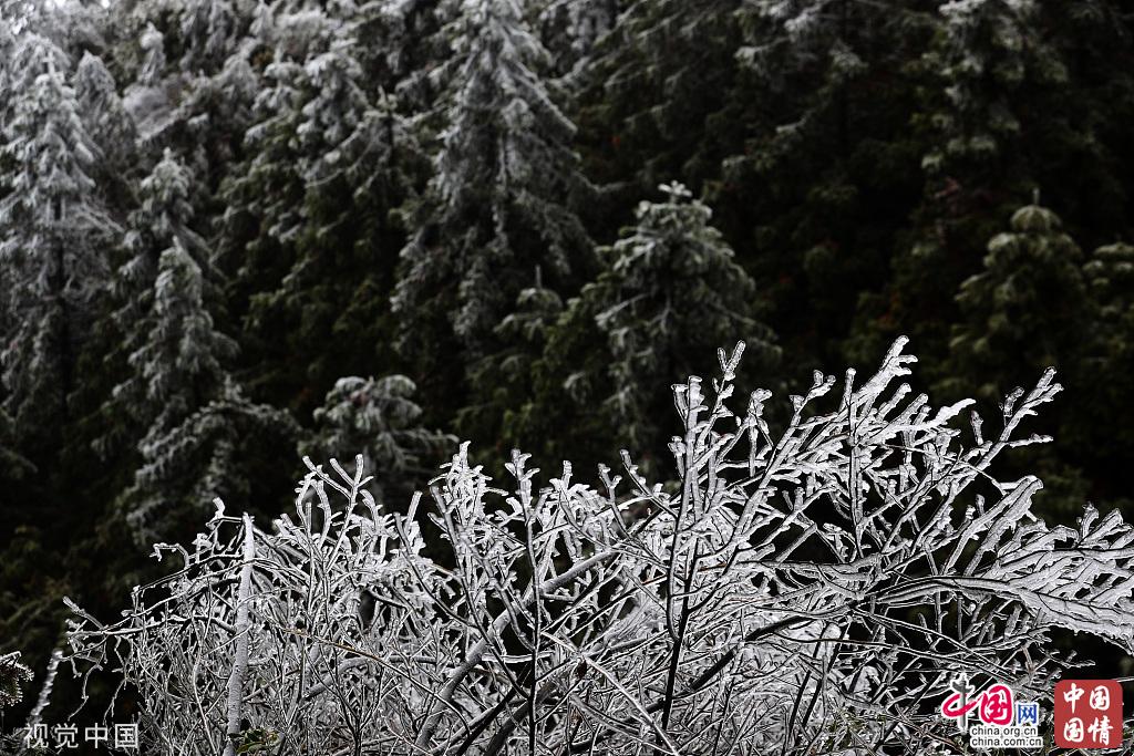 2019年11月26日,重庆,受冷空气的影响,黔江区国家森林公园马喇镇灰千梁子景区出现雾凇,玉树琼枝,千姿百态,如同童话世界。