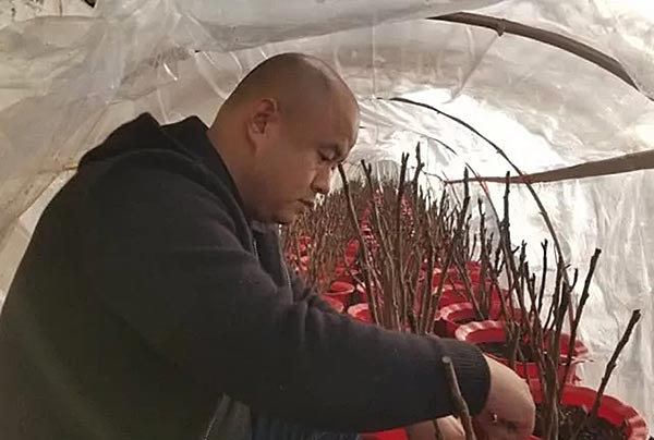 早在2011年,菏泽花农赵银增曾经用40余盆什样锦搞过反季节催花,引起广泛关注。所谓什样锦牡丹,也称什锦牡丹,是指一株牡丹经高科技嫁接开出多个品种、多种颜色的牡丹花。其中一盆一米高的牡丹母本上,就嫁接了岛锦、卷叶红、芳距、海黄、金黄、金阁等六个品种。什样锦牡丹技术含量非常高,在自然条件下成活开放就已经非常难得,使其在严寒的冬季开花更是十分困难。成本高、成活率低,必然推动什样锦催花牡丹价格的上涨。据赵银增介绍,一盆什样锦催花牡丹的成本相当于普通牡丹的3至5倍。