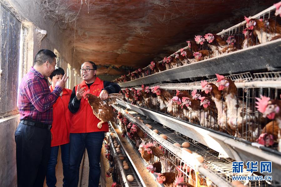 在山东省枣庄市台儿庄区涧头集镇一养鸡场,畜牧水产科技扶贫服务队的岳庆磊(右一)向养殖户传授养鸡知识(11月6日摄)。台儿庄区将科技特派员制度和脱贫攻坚工作紧密结合,成立科技扶贫服务队,送科技下乡,助力群众脱贫致富。 新华社记者郭绪雷摄