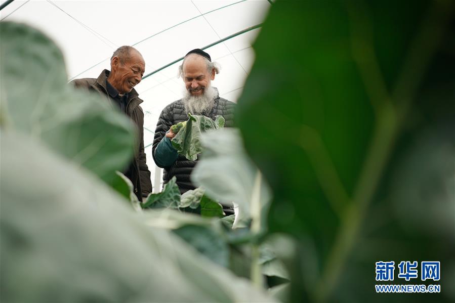以色列专家(右)在河北省邢台市威县枣元乡蔬菜种植基地内指导曾经的贫困户查验蔬菜长势(11月27日摄)。威县自2018年9月退出贫困县序列以来,通过推进兴产业、强就业、促创业、发展手工业“四业”富民工程,逐步构建精准防返贫长效机制。 新华社记者 牟宇 摄