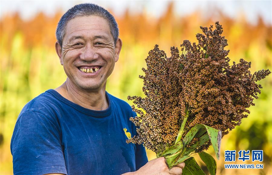 枣强县肖张镇西赵庄村的村民展示收获的高粱(10月7日摄)。2018年以来,河北省枣强县调整农业产业结构,引进抗旱、抗病虫害优质高粱品种,引导农民发展高粱种植,带动农业增效、农民增收。 新华社记者 李晓果 摄