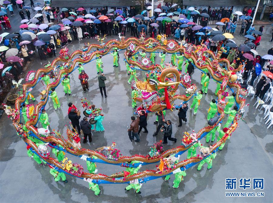 乡村女子舞龙队队员抬着富有特色的板龙在浙江省杭州市富阳区湖源乡窈口村广场上表演,在浓浓的传统山乡喜庆氛围中迎接元宵节(2月17日无人机拍摄)。 新华社记者 徐昱 摄