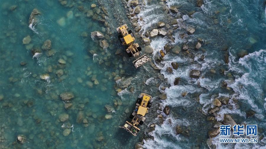 在帕米尔高原深处的新疆塔什库尔干塔吉克自治县大同乡库如克栏杆村,电力工人利用施工车辆运送水泥、铁塔零件过河,为铺设线路做准备(11月24日无人机拍摄)。新疆加大投入,实施光伏供电村电网延伸工程,建成后将惠及多个偏远村庄。 新华社记者 胡虎虎 摄