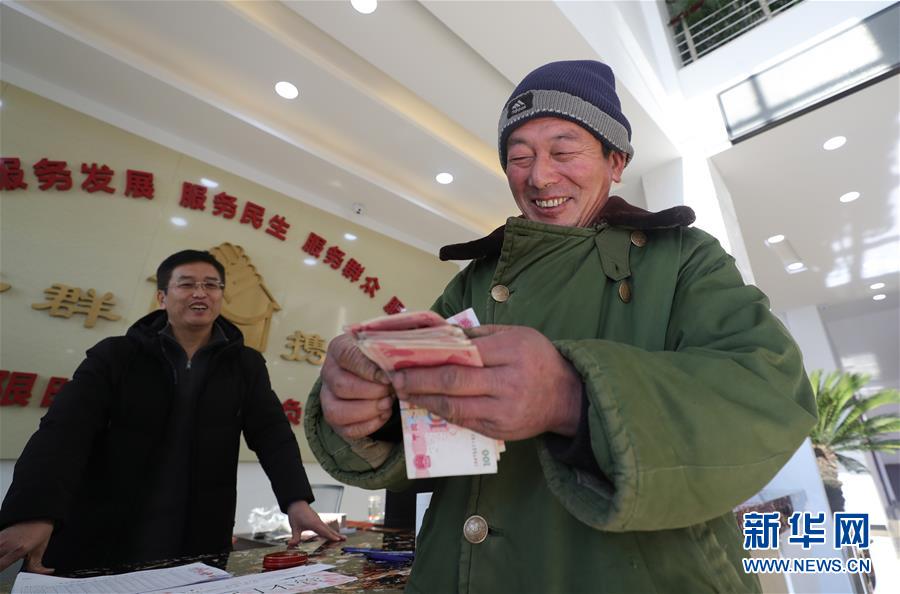 辽宁省海城市中小镇中小村农业合作社成员黄华(右)在村委会领取2019年的土地流转费用和分红(12月17日摄)。 新华社记者 杨青 摄