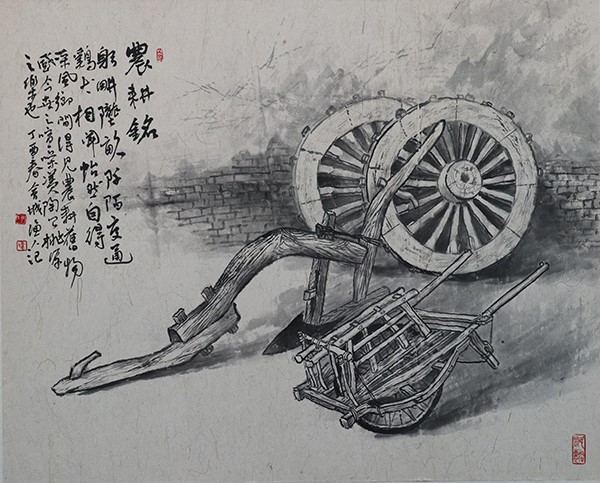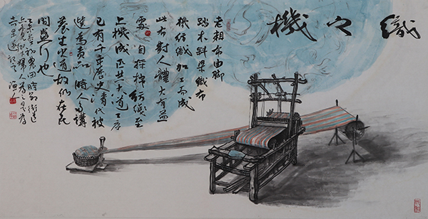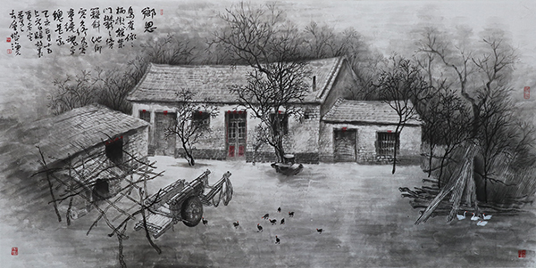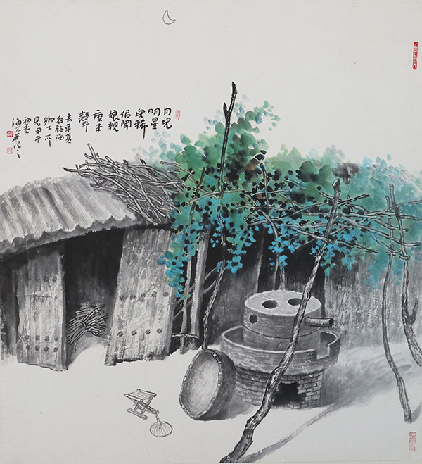 屋檐下悬挂着的老玉米、风蚀残缺的石磨碾盘、透风的船棚、仍能使用的旧织布机……在巩绪伟的作品中,这些带有沧桑感的物件与场景, 无不传递着浓浓的乡情,无不见证那些年代的岁月沧桑。谈起创作的初衷,巩绪伟说,“承载人们记忆的这些景象在逐年消逝,我的内心是痛苦的。正是缘于这种情结,我有种莫名而强烈的创作冲动,就想用笔墨语言将它们记录下来,使民俗文化得以再现和传承。”