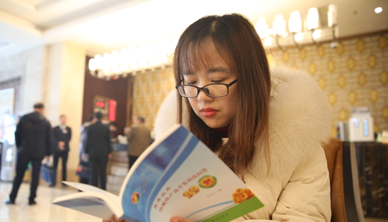 (菏泽市政协委员李明霞翻阅《菏泽牡丹功能性产品开发科技问答99例》)