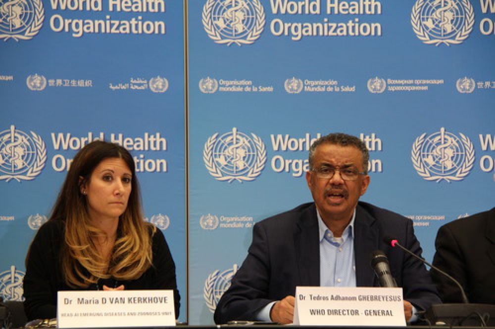 1月23日,在瑞士日内瓦世界卫生组织总部,世卫组织总干事谭德塞(右)在记者会上发言。新华社记者刘曲摄