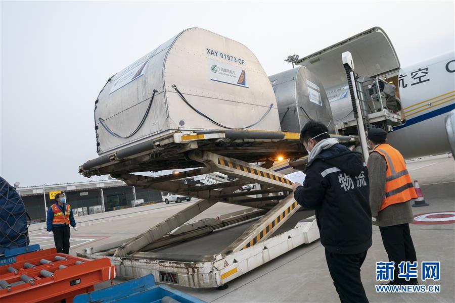 1月29日,一架中国邮政航空货机在卸载援助物资。新华社记者 熊琦 摄