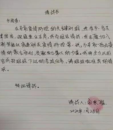 “我志愿加入新型冠状病毒肺炎疫情防控第一线,为夺取抗击疫情的最后胜利,贡献自己最大的力量……”