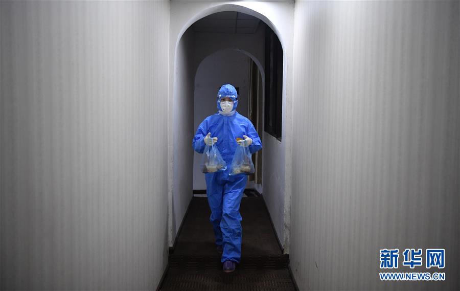 2月5日,在河南信阳,工作人员为湖北籍隔离人员送去早餐热干面。