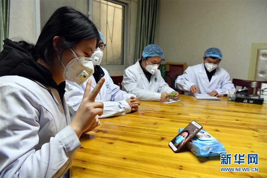 2月4日,在河南信阳,工作人员与湖北籍隔离人员进行视频通话。
