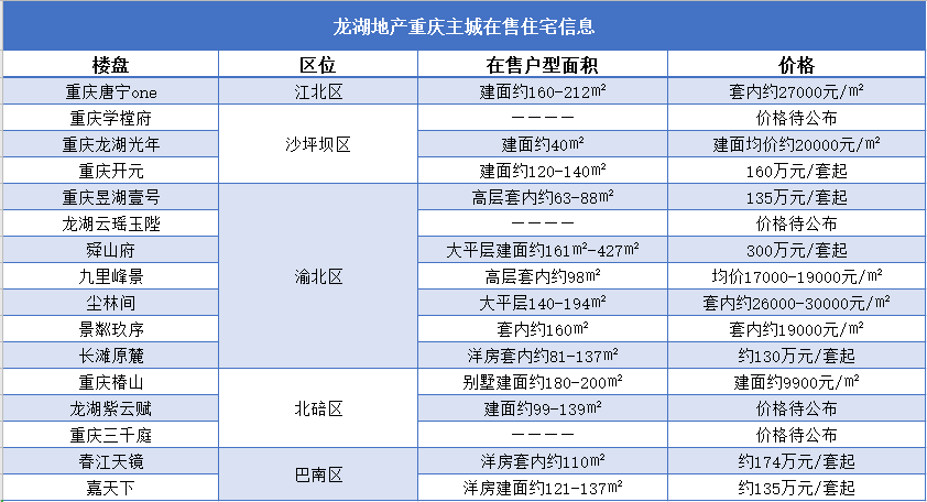 龙湖地产重庆主城在售住宅产品信息