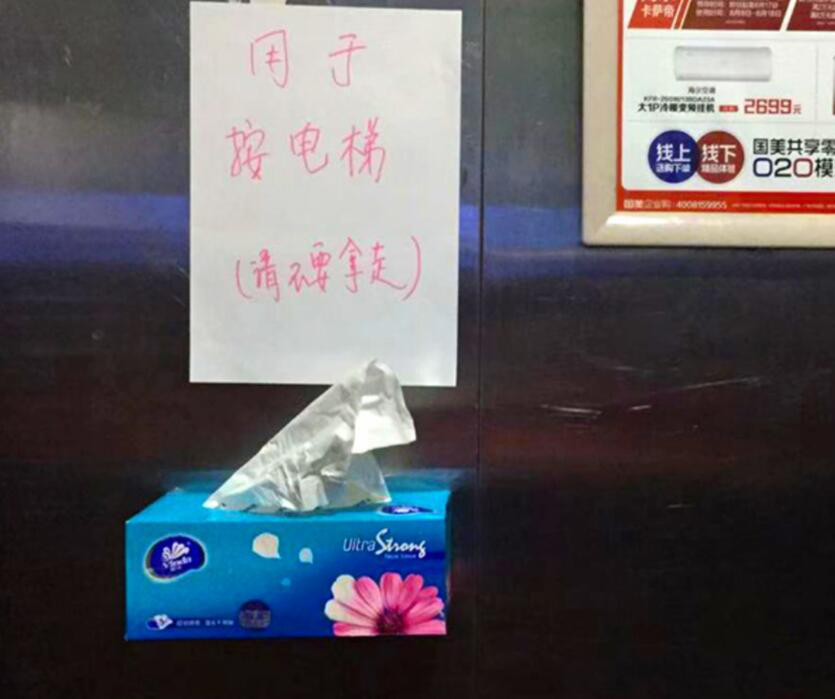 广厦城社区志愿者丁长芬将家中的纸巾盒贴到电梯里,以方便居民使用。