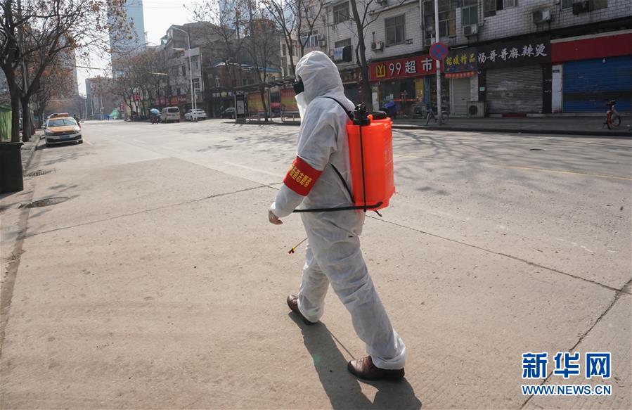 2月9日,武汉市江岸区花桥街道志愿者在对街区进行消杀作业。 新华社记者 程敏 摄