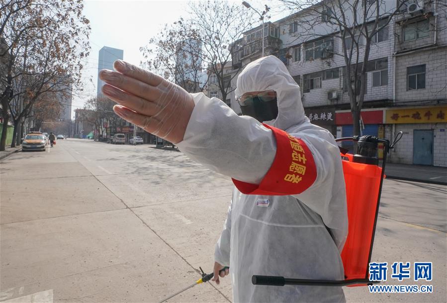 2月9日,武汉市江岸区花桥街道志愿者在对街区进行消杀作业。 新华社记者 程敏 摄