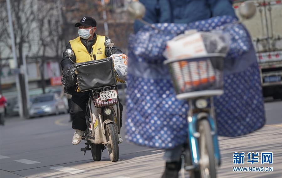 2月9日,一位送货员在武汉市江岸区花桥街道送货。 新华社记者 程敏 摄