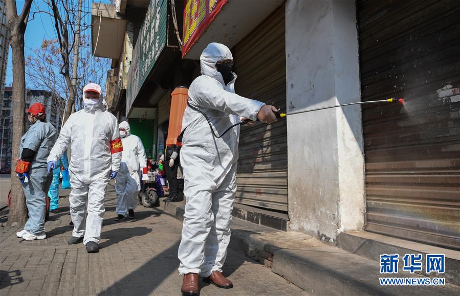 2月9日,武汉市江岸区花桥街道志愿者在对街区进行消杀作业。 新华社记者 程敏 摄