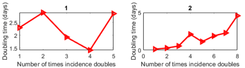 所以,所有非湖北省份的总累积发病率随时间增加(图中的2),表明该流行病在湖北以外地区呈次指数增长。这与自春节以来,各省份的自我隔离和对来自武汉实施旅游检疫(2020年1月23日实施),使得全国各地有不同程度的跨省跨市旅游限制,都可以解释“零散的”(piece-meal)时间成倍增长的现象。