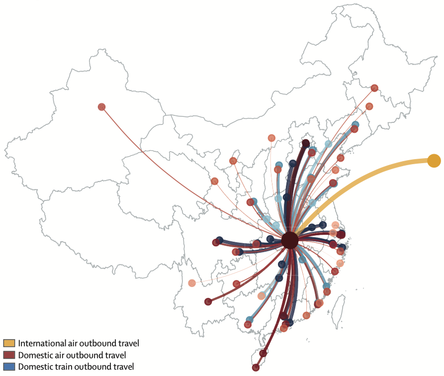 ▲图2:2019年春运期间从武汉出发的主要航空和火车出行路线