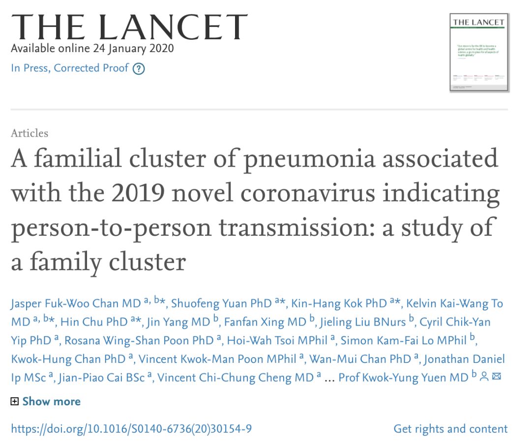 最早确认新冠肺炎具有“人传人特征”以及“无症状病例”的论文,是一篇1月24日发表在知名医学期刊《柳叶刀》的论文,名为《A familial cluster of pneumonia associated with the 2019 novel coronavirus indicating person-to-person transmission: a study of a family cluster》(《与2019年新型冠状病毒相关的家族性肺炎,表明人与人之间的传播:家庭聚类研究》)。