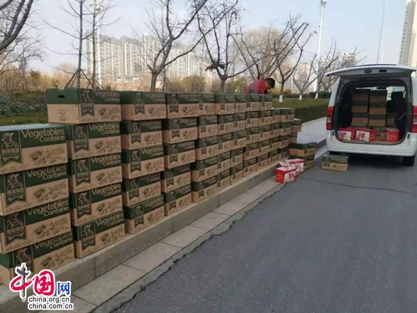 这几天,临沂市南坊新区的路边,每天都能见到这样的场景,近百箱蔬菜摆放整齐,分发给骑手送至各小区。允许进入的小区送至订购户楼下,不允许进入的小区送至小区门口,电话通知订购户领取。