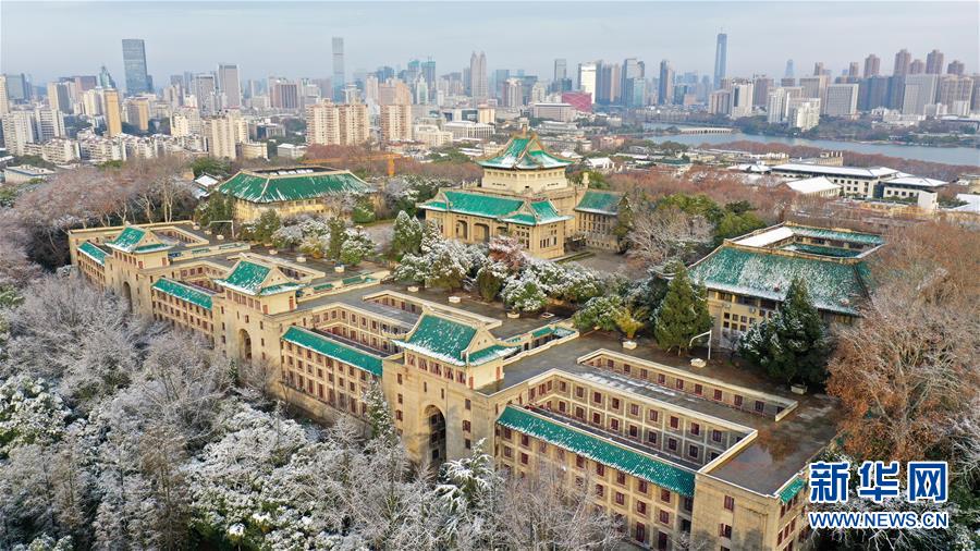 这是2月16日拍摄的雪后的武汉大学樱园和老图书馆,与远处的武汉城市楼群相映成景(无人机照片)。 2月15日,武汉迎来一场降雪。2月16日清晨,雪后初霁,阳光洒在武汉大学的建筑群上,景色如画。 新华社记者 陈晔华 摄