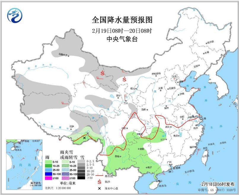 今明天,中东部雨雪仍然稀少,青藏高原及西南地区雨雪不断,西北地区降雪增多。中央气象台预计,18日08时至19日08时,新疆北部、青藏高原东部等地部分地区有小到中雪或雨夹雪,其中,新疆沿天山地区及伊犁河谷、西藏东部等地部分地区有大雪(5~8毫米)。西藏东南部、四川盆地南部、云南中东部、贵州西部、重庆等地部分地区有小到中雨。