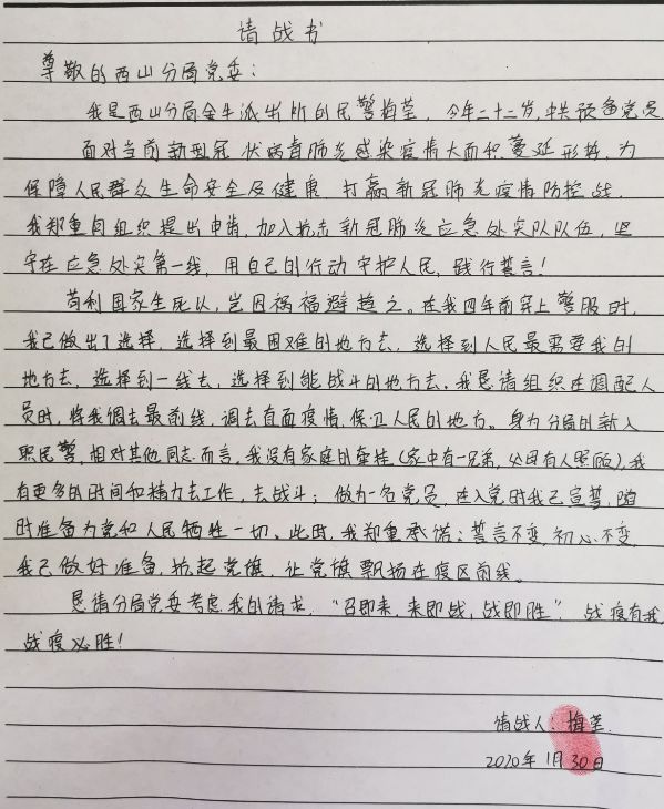 这是一场没有硝烟的战争,充满着生与死的考验。“面对当前新型冠状病毒肺炎感染疫情大面积蔓延形势,为保障人民群众生命安全及健康,打赢新冠肺炎疫情防控战,我郑重向组织提出申请,加入抗击新冠肺炎应急突击队,坚守在应急处突第一线,用自己的行动守护人民,践行誓言。”梅莹郑重承诺道。她主动送走了来昆探望自己的父母,取消休假,主动请缨到疫情防控的第一线。