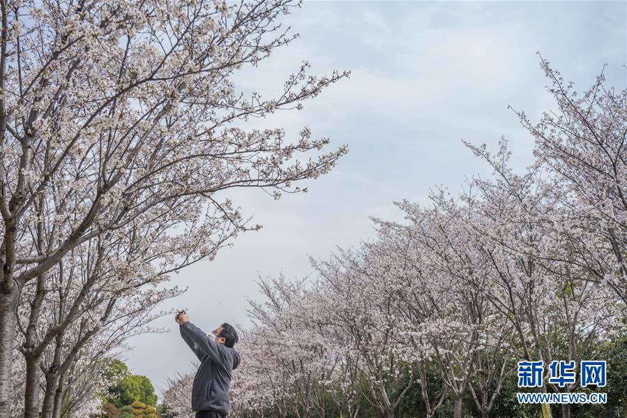 3月19日,在武汉市武昌区被网友称为“武汉最美停车场”的湖北日报停车场,一名工作人员在拍摄樱花。 进入3月中旬,武汉气温渐升,武汉市各处樱花次第开放。 新华社记者 才扬 摄