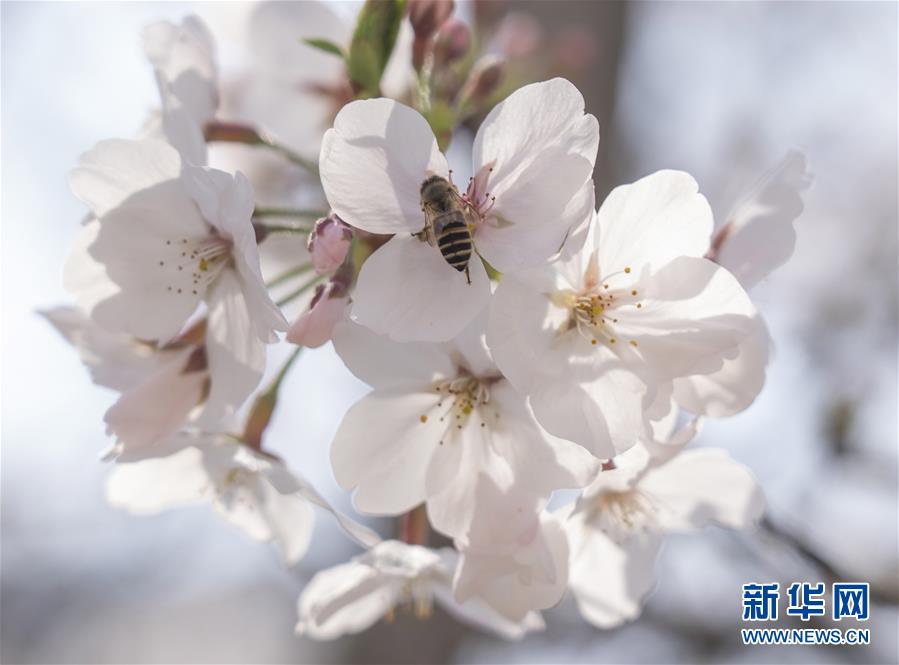 3月19日,在武汉市武昌区被网友称为“武汉最美停车场”的湖北日报停车场,一名工作人员在拍摄樱花。 进入3月中旬,武汉气温渐升,武汉市各处樱花次第开放。 新华社记者 才扬 摄